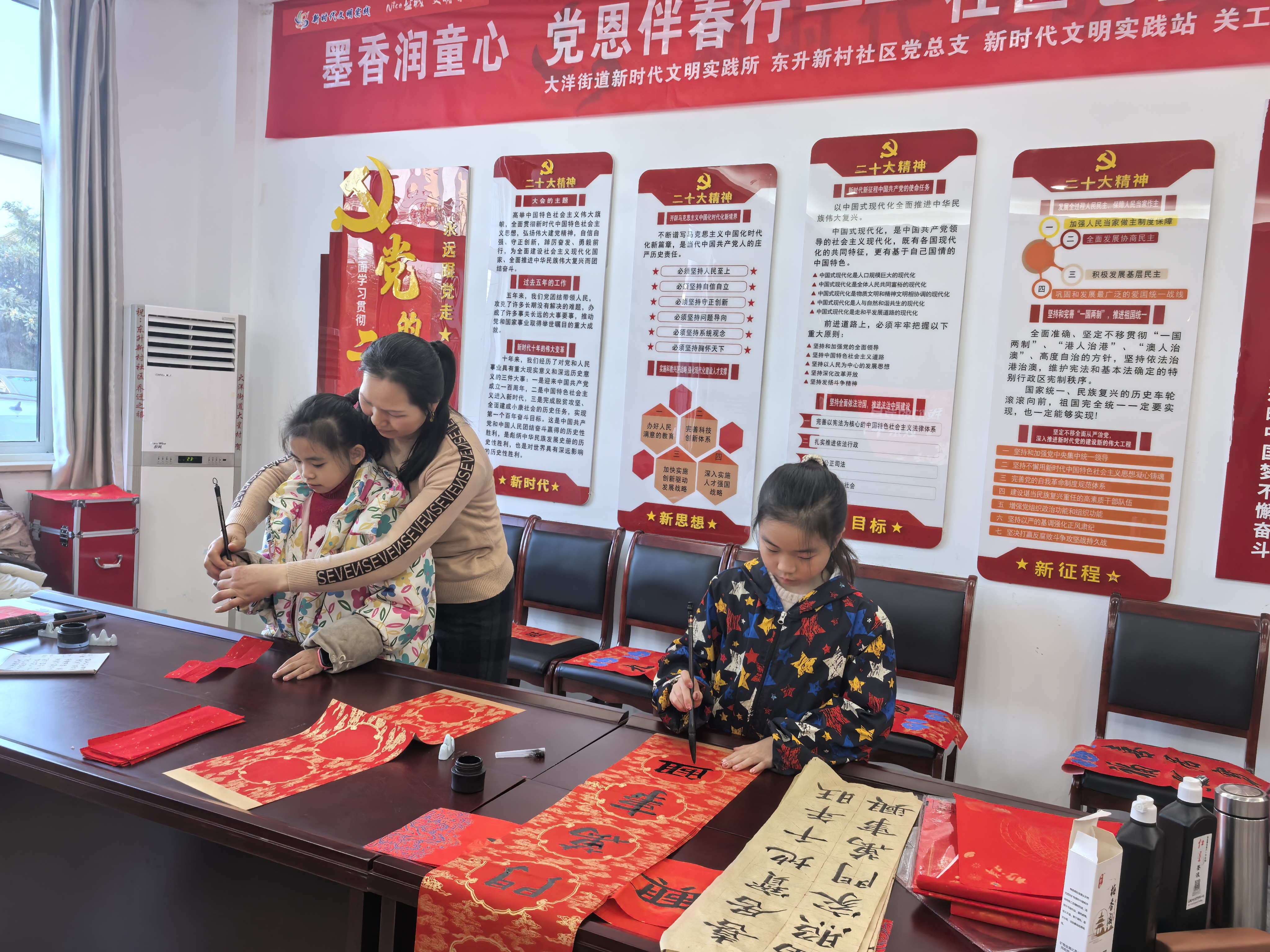 大洋街道新时代文明实践所、东升新村社区等联合开展“墨香润童心·党恩伴春行——社区老少同书联”主题活动