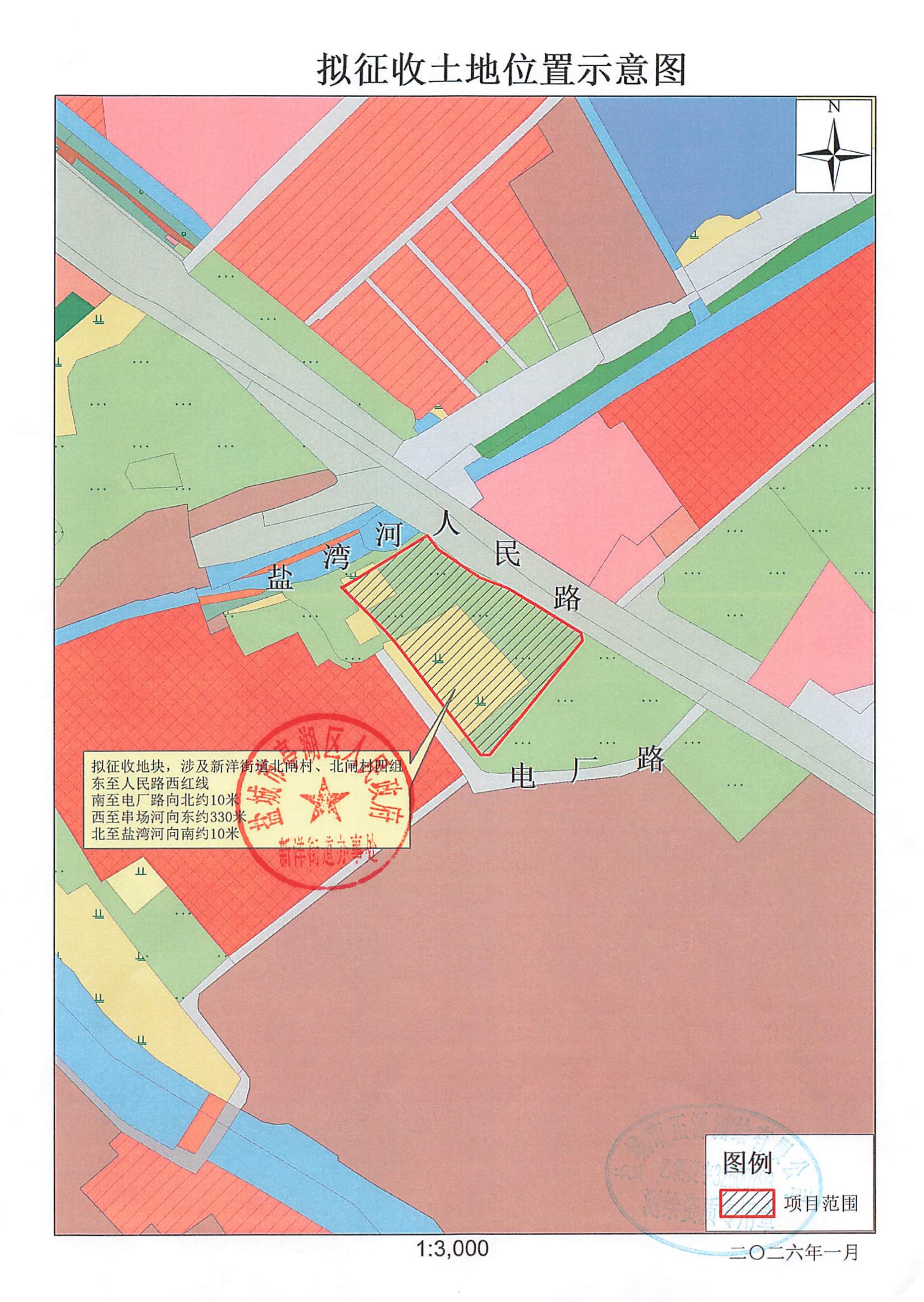 本次拟征收土地位于新洋街道北闸村、北闸村四组范围内。拟征收土地位置详见附图。